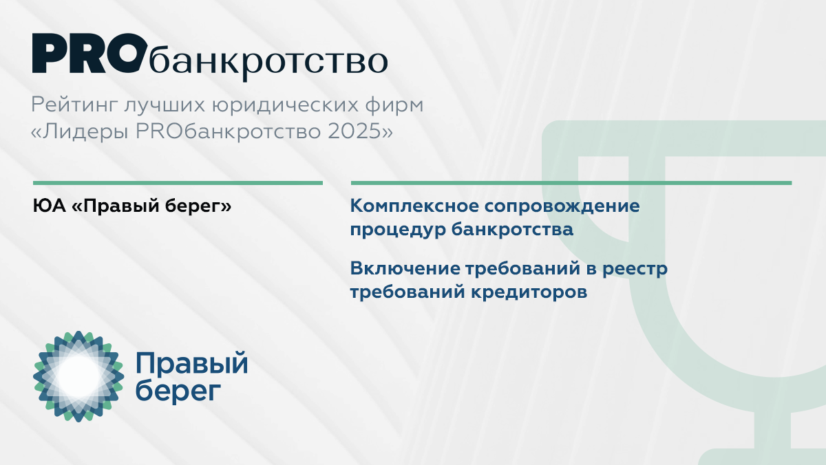 Результаты рейтинга подтверждают сильные позиции ЮА «Правый берег» в практике банкротства и успехи нашей команды в системной работе с процедурами и требованиями кредиторов. Благодарим профессиональное сообщество за высокую оценку и продолжаем развивать экспертизу в интересах бизнеса клиентов.
