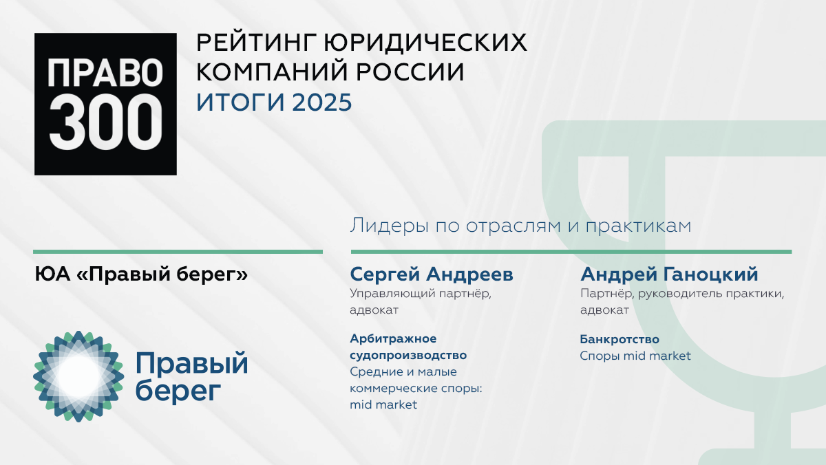 Полученное признание подтверждает устойчивые позиции ЮА «Правый берег» в сфере арбитражных процессов, коммерческих споров и банкротства. Благодарим клиентов и партнёров за доверие и совместные результаты.